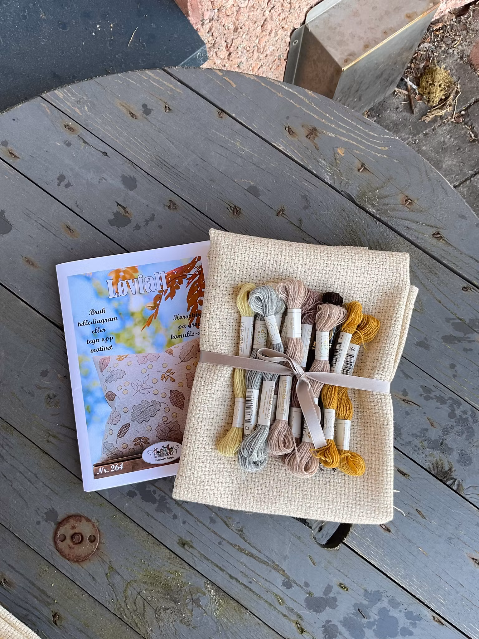 Du får med 70x70 cm Aida stoff og 10 dk DMC Ullgarn Og 2 stk DMC bomullsgarn Nok til å sy en pute