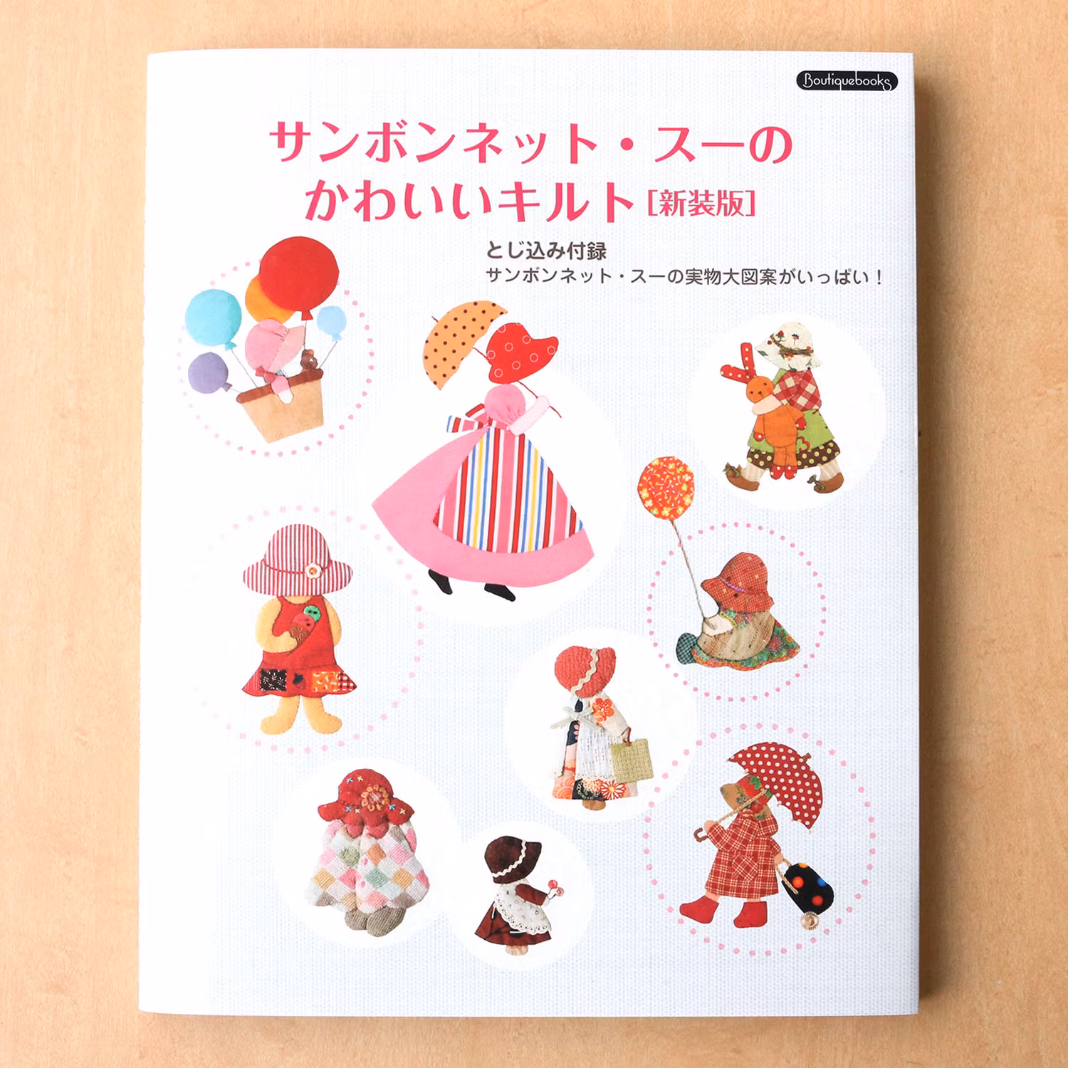 En nydelig bok med Sue Bonnett motiver på veske, småmapper og lappeteppe, Teknikker applikasjoner og lappeteknikk. Språk Japansk. Boka har gode bilder og illustrasjoner