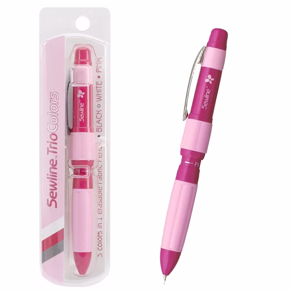 Med denne pennen" har du 3 forskjellige penner (3 mekaniske blyanter i forskjellige farger) i en! Den er perfekt for å skissere design for sying", patchwork og broderi", kan du til og med tegne veldig fine linjer. Siden denne pennen er vannløselig", vil den lett forsvinne hvis stoffet kommer i kontakt med vann. Hvis du vil fjerne linjene raskt, bruk viskelæret.